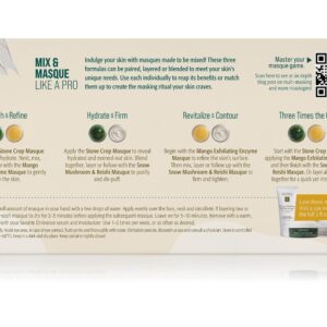 Directions: Start with the Stone Crop Masque before applying the Mango Exfoliating Enzyme Masque, and finish with the Snow Mushroom & Reishi Masque. Or layer all three masks together for a quick, yet intensive, treatment.